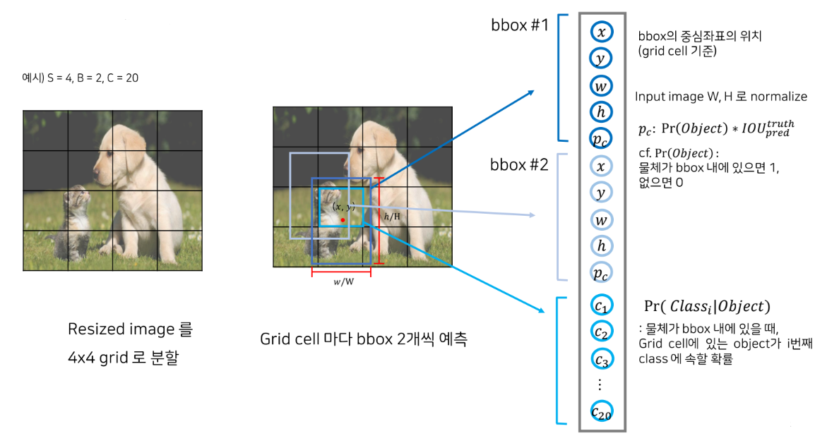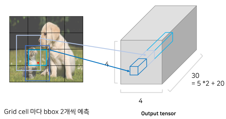 이미지를 4x4 그리드로 나눈다 가정하고, (실제 논문에서는 7x7) 이때 각 그리드 셀마다 예측하는 바운딩 박스는 2개이며 전체 고려하는 class 개수는 20개로 가정을 해보자.
