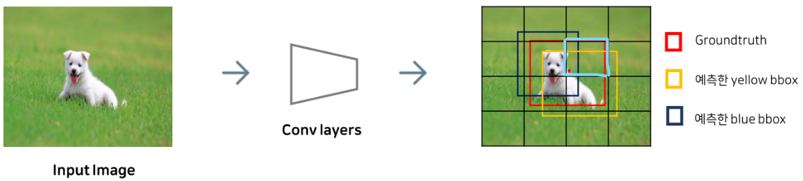 위 그림에서 보면 하늘색 그리드 셀이 강아지를 찾는데 responsible한 셀이 되는 것이다. (정답 강아지의 Ground truth 박스의 중앙이(빨간 점) 위치하기에)