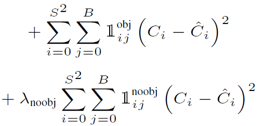 빨간 박스는 confidence loss인데 모든 grid cell에서 예측한 B개의 클래스에 속할 확률값과 GT 값의 오차를 구하는 공식이다