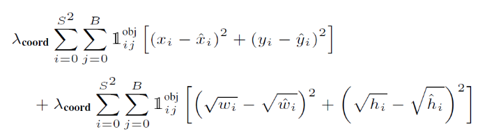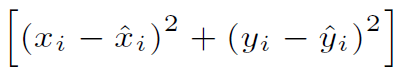 대괄호 안의 식은 예측한 바운딩 박스의 중심 좌표 x i hat, y i hat과 ground truth의 중심 좌표 x i , y i의 오차 제곱을 나타내는 식이다.