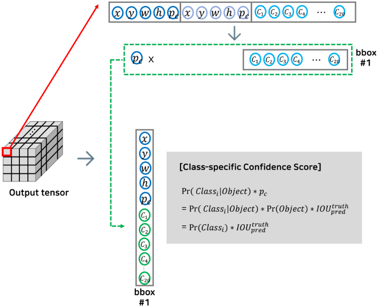Ci : 모델에서 구한 object일 확률 값과 IOU를 곱해 얻게 된다.