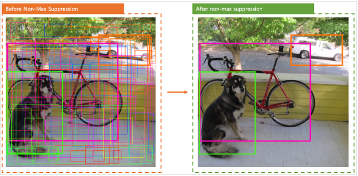 각 cell마다 confidence score 이 가장 큰 박스를 고르고 선택한 박스와의 IOU가 임계값 보다 큰 박스는 모두 제거한다.