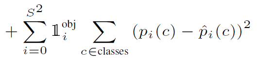 초록 박스는 classification loss인데 cell 내에 클래스가 존재할 확률을 구하는 공식이다.