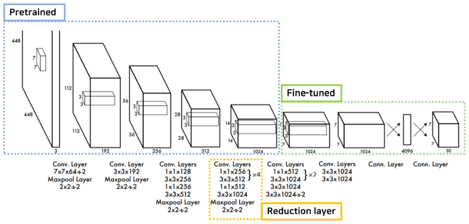 앞의 20개의 conv layer에 대해서는 1000개 클래스의 ImageNet 데이터셋으로 pretrained 된 부분이고 뒤에 4개의 conv layer와 2개의 fc layer를 더 붙여서 Pascal VOC 데이터로 Fine tuning 시킨 과정을 거쳤다.
