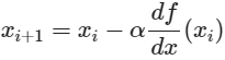 xᵢ번째 에서의 기울기에 α 인 step size를 곱하고 기울기의 부호의 반대로 움직임으로써 마이너스 기호를 사용하여 xᵢ 번째에서 xᵢ₊₁번째로 이동을 하는 것이다.