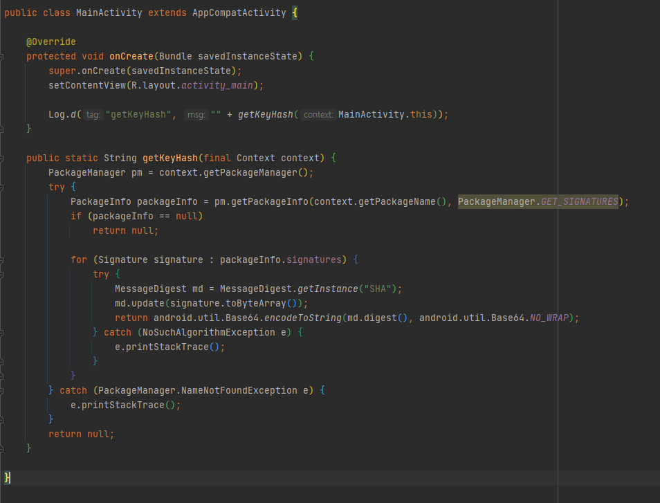 위와 같이 코드를 작성하고 프로젝트를 실행하면 로그를 통하여 해쉬값을 얻을 수 있습니다.