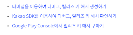 - 릴리즈 키 해시: 앱 스토어에 앱을 배포하기 위해 생성한 릴리즈 인증서로부터 해시한 값입니다.