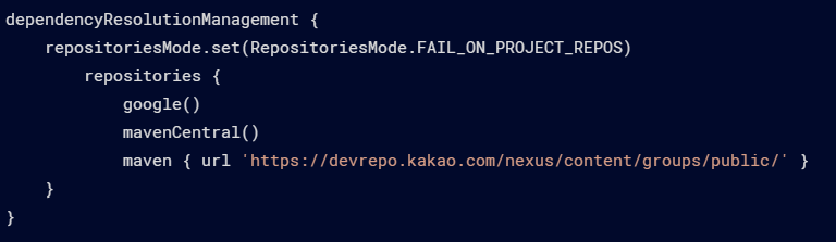 Android SDK를 적용할 프로젝트의 settings.gradle(Project) 파일에 다음과 같이 Android SDK 레파지토리를 설정합니다. (최신 Android Studio일 경우)
