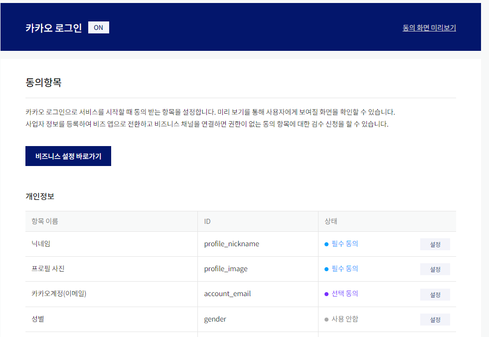 동의 항목 설정 (내 애플리케이션>제품 설정>카카오 로그인>동의항목) 도 직접 할 수 있습니다.