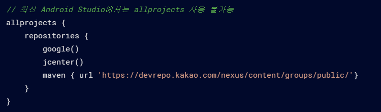 Android SDK를 적용할 프로젝트의 build.gradle(Project) 파일에 다음과 같이 Android SDK 레파지토리를 설정합니다.