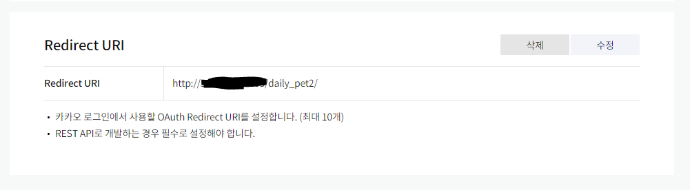 (내 애플리케이션>제품 설정>카카오 로그인) 에서 Redirect URI를 설정합니다.