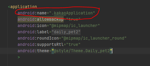 AndroidManifest.xml 의 application에도 Kakao SDK 초기화를 수행한 클래스의 이름을 설정해야 합니다. 여기에서는 kakaoApplication 클래스에서 초기화를 했으므로 위와 같이 동일한 이름을 설정에 추가합니다.