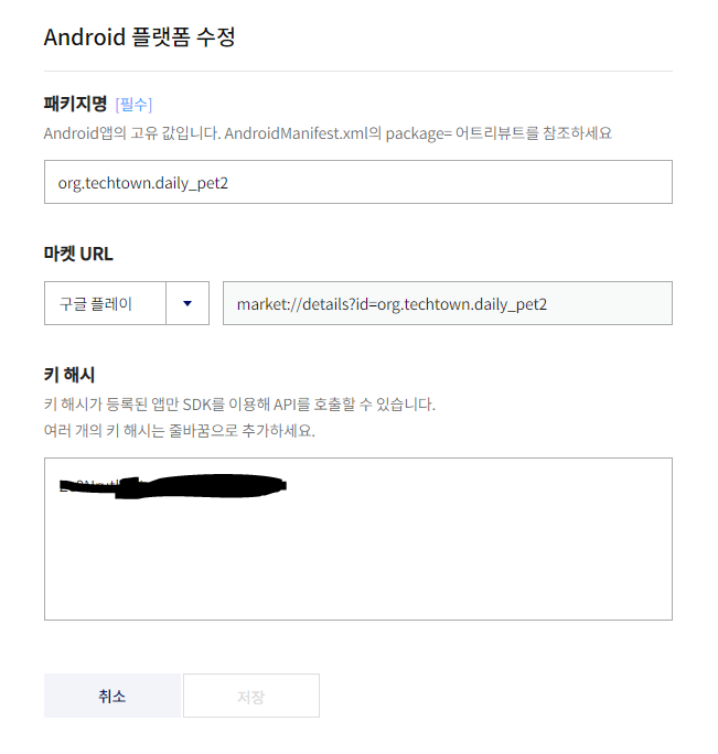 이제 얻은 해쉬값을 복사하여 ( 내어플리케이션 -> 앱 설정 -> 플랫폼) 에서 Andoroid 의 우측 수정을 눌러 해쉬값을 넣어 주겠습니다.