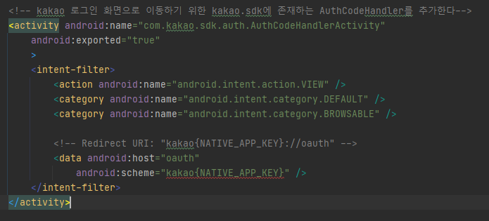 그리고 매니페스트에는 kakao 로그인 화면으로 이동하기 위한 kakao.sdk에 존재하는 AuthCodeHandler를 추가해줍니다. andorid:scheme에 들어가는 string 값은 kakao+ native앱키 입니다.